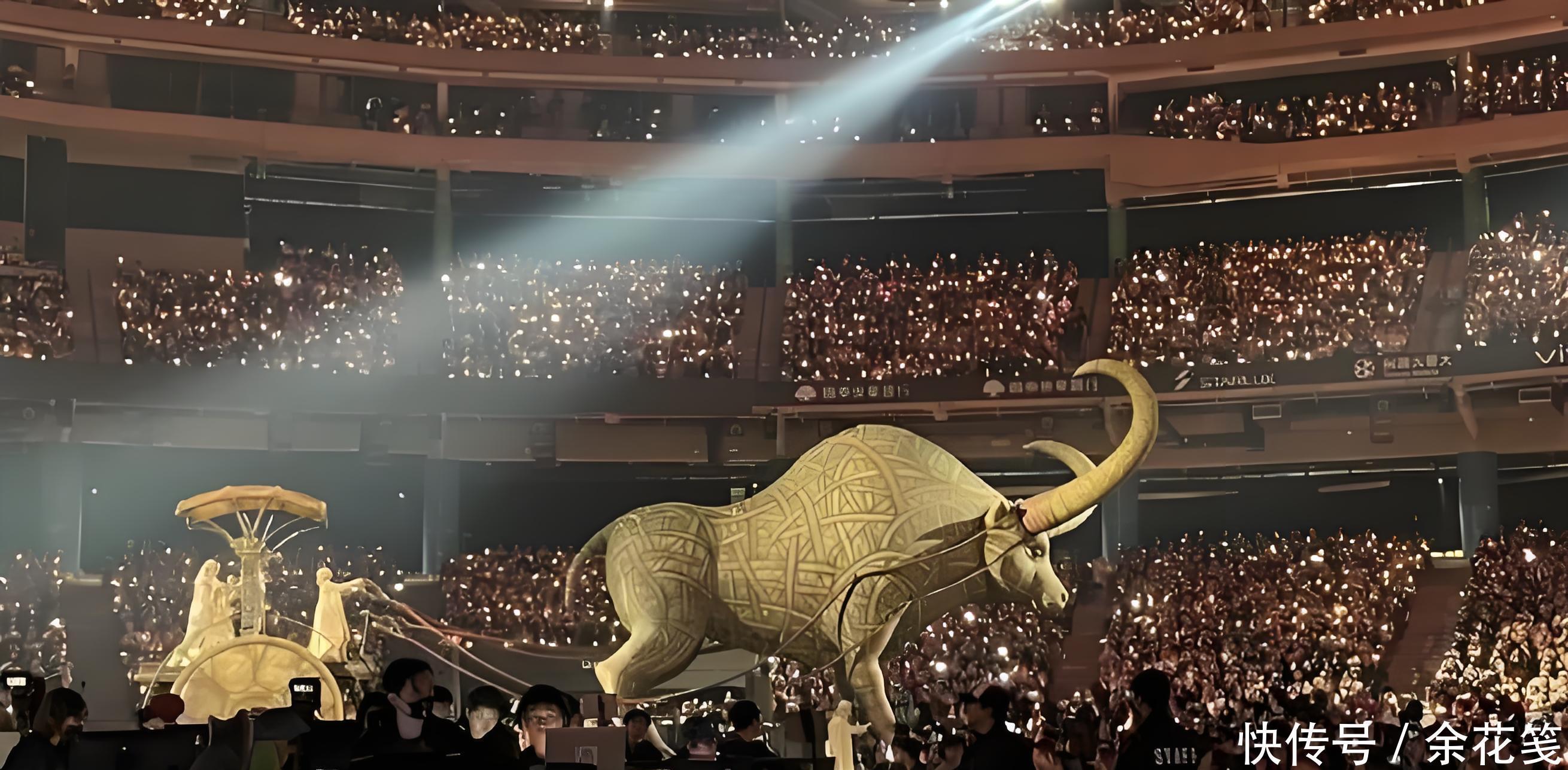 开场还有三层楼高的金色公牛绕场巡行,暗色调灯光打下来,加上黑色巨型翅膀、悬空剑阵这些道具,别说敏感的人了,就算是胆大的,看久了也觉得后背发凉,瘆得慌。