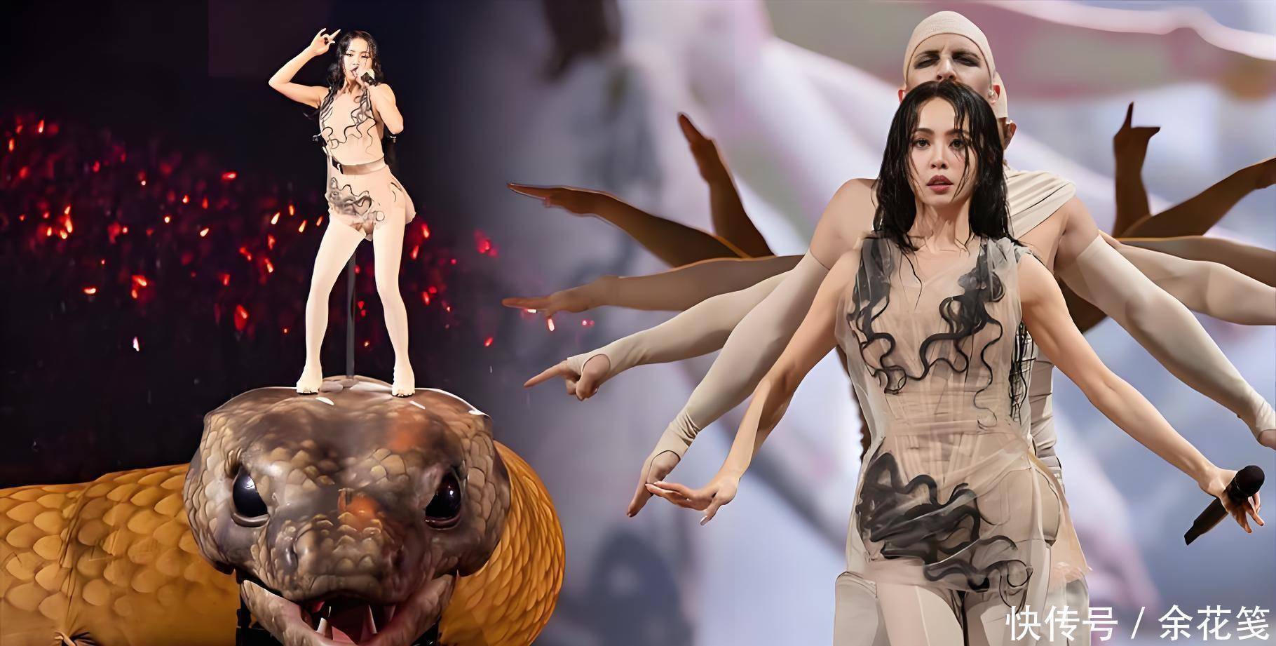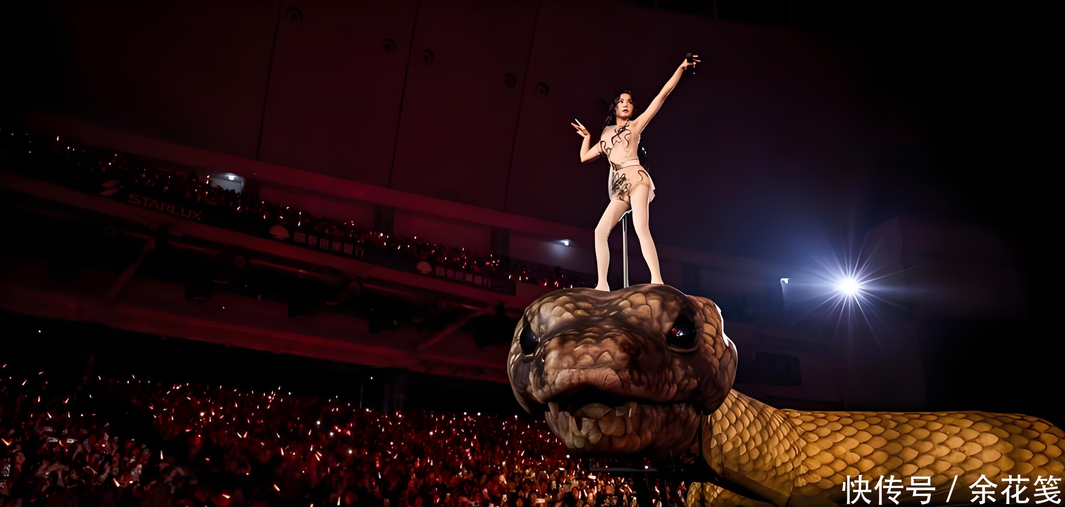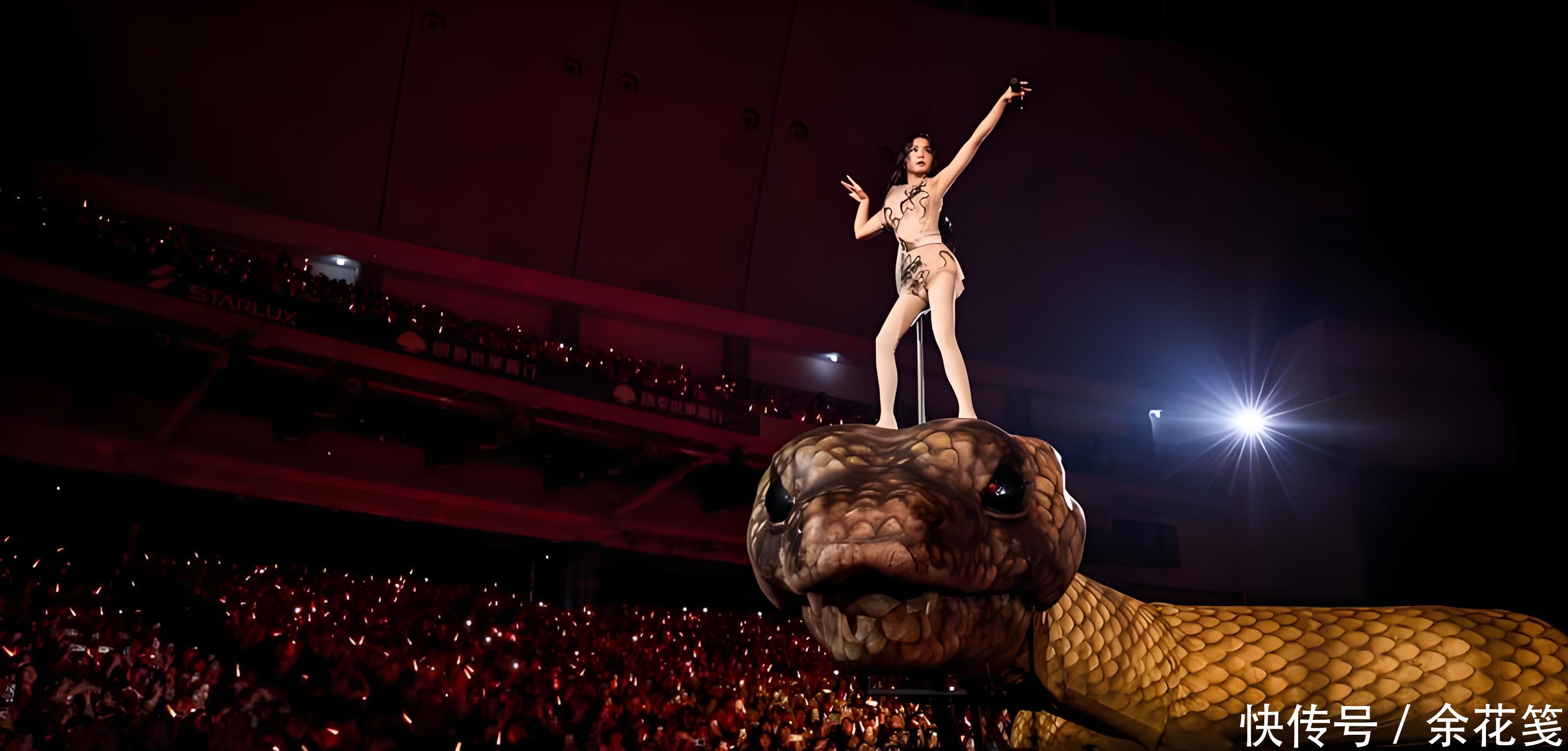咱先不说别的,就单看现场流出的视频,那视觉冲击力,直接给人看麻了!30米长的巨型机械蛇缠绕在舞台中央,金属质感反光配上烟雾特效,还能灵活扭动吐雾,蔡依林穿着透肤马甲直接站在蛇身上开唱;